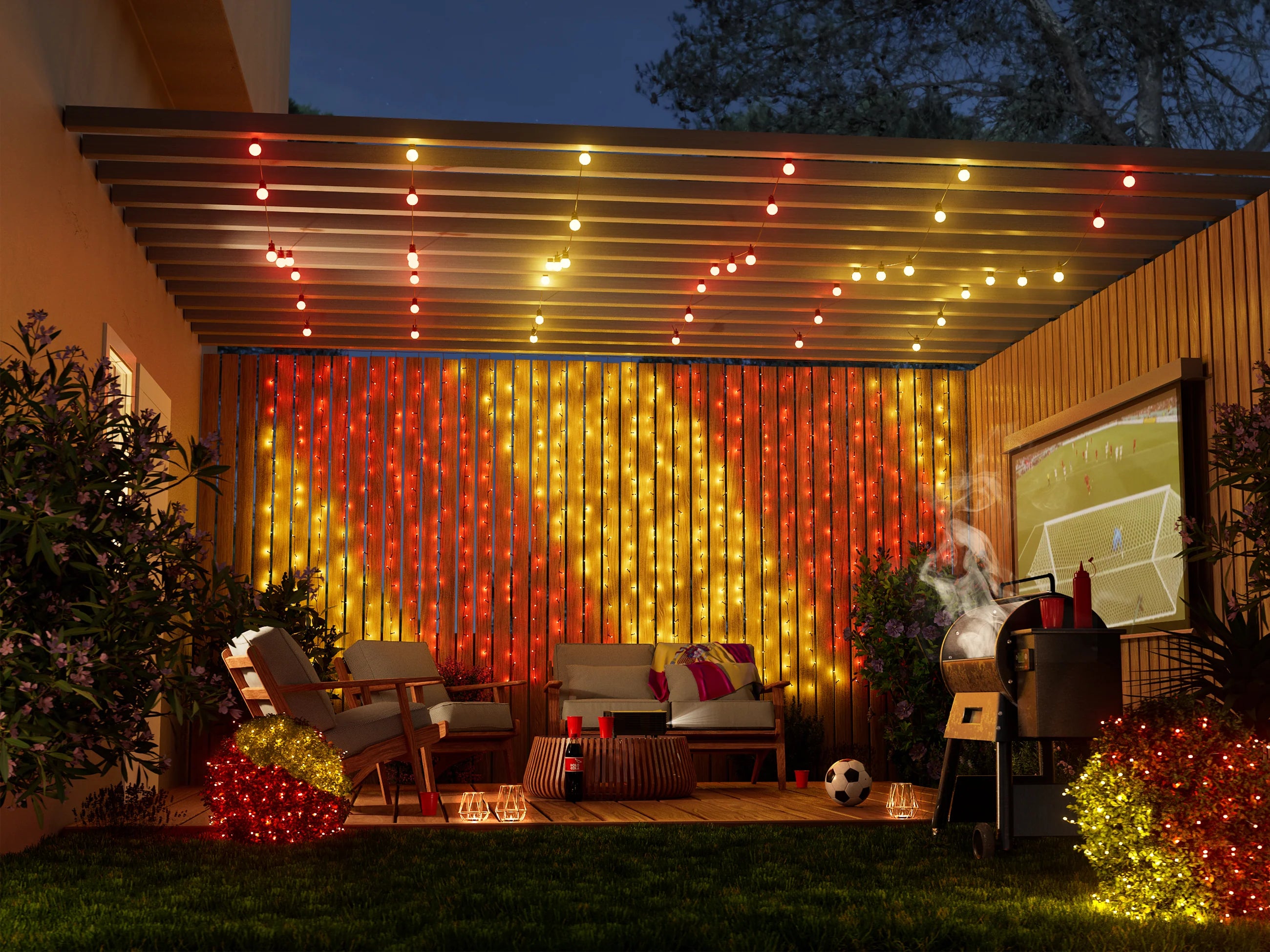Umieść lampki zewnętrzne Twinkly w dowolnym miejscu, od drzew i ogrodzeń po taras, patio lub dach domu. Technologia mapowania pozwala kontrolować oświetlenie niezależnie od jego położenia.