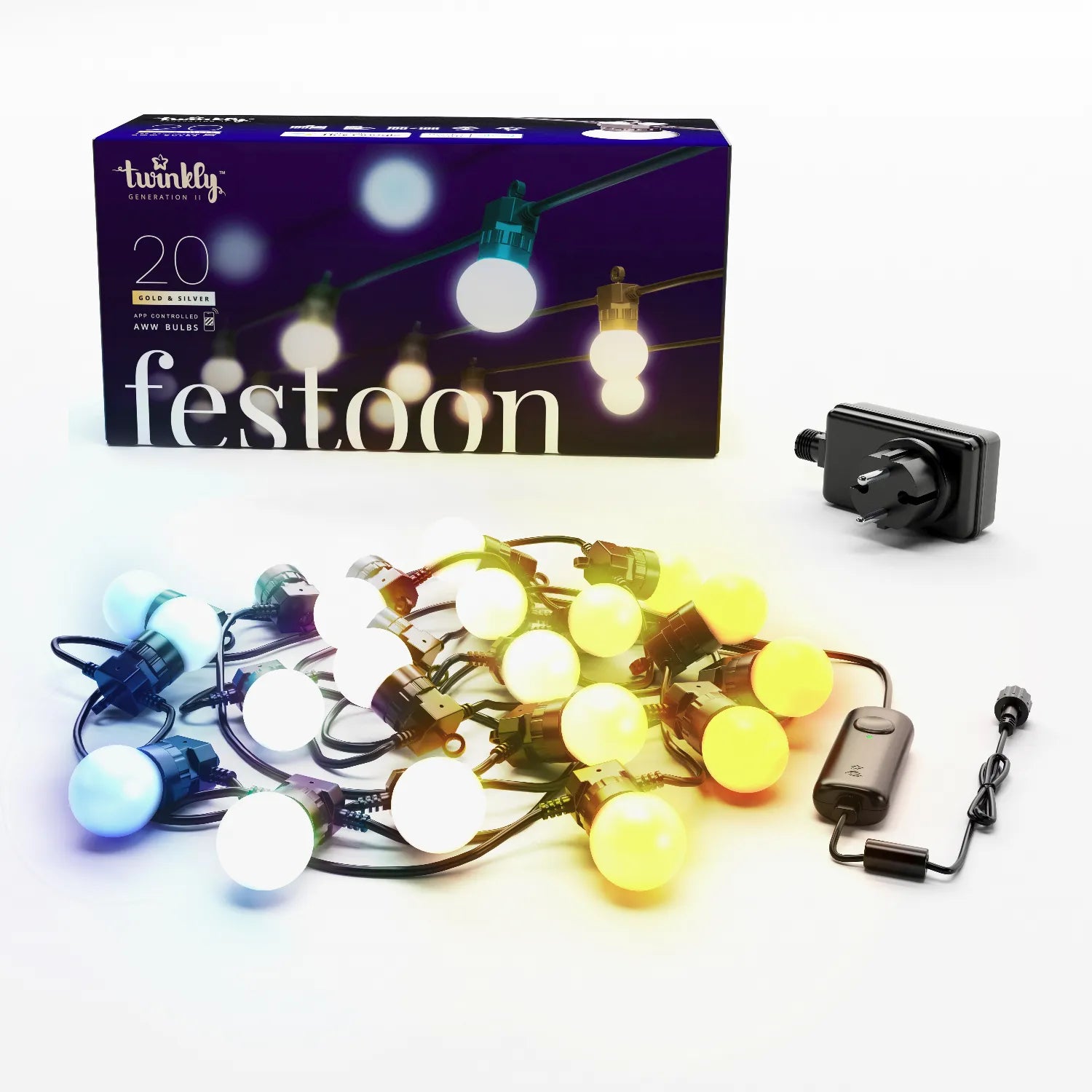 Odmień przestrzeń na zewnątrz, tworząc wyjątkowy klimat dzięki girlandom świetlnym Twinkly Festoon. Dzięki olśniewającej palecie odcieni złota i srebra rozświetlą każdą okazję – od świątecznych wieczorów po spokojne noce pod gwiazdami.
