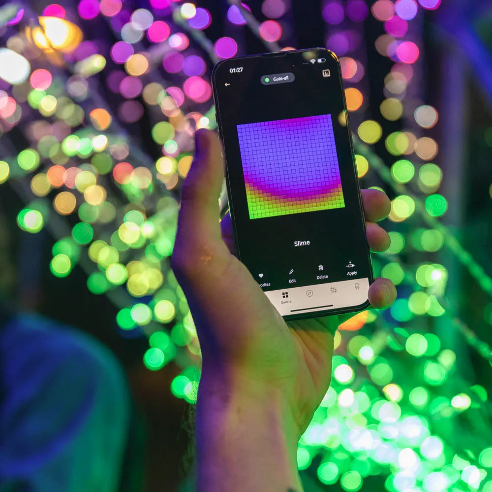 Łącz i dopasowuj oświetlenie Twinkly Plus na tym samym kontrolerze, grupuj je płynnie z innymi kontrolerami lub synchronizuj z posiadanymi już lampkami Twinkly, aby uzyskać spójne instalacje złożone z dziesiątek tysięcy diod LED.